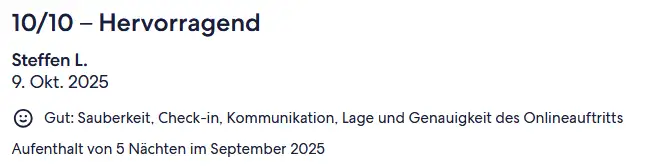 Fewo Direkt 10 Punkte Bewertung: Hervorragend